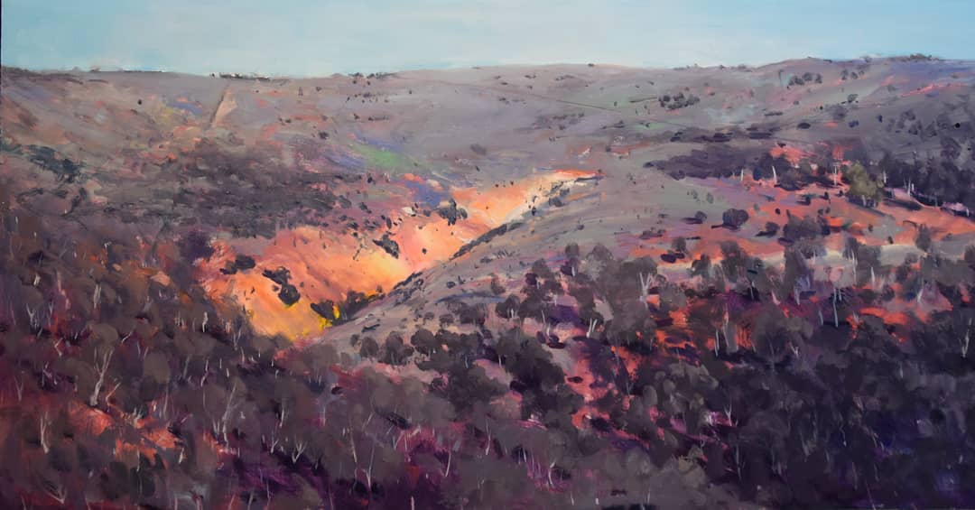 Big view from Werribee Gorge. Bit abstract but I like all the colours. 40cm x 80cm oil on panel.